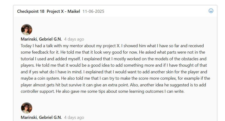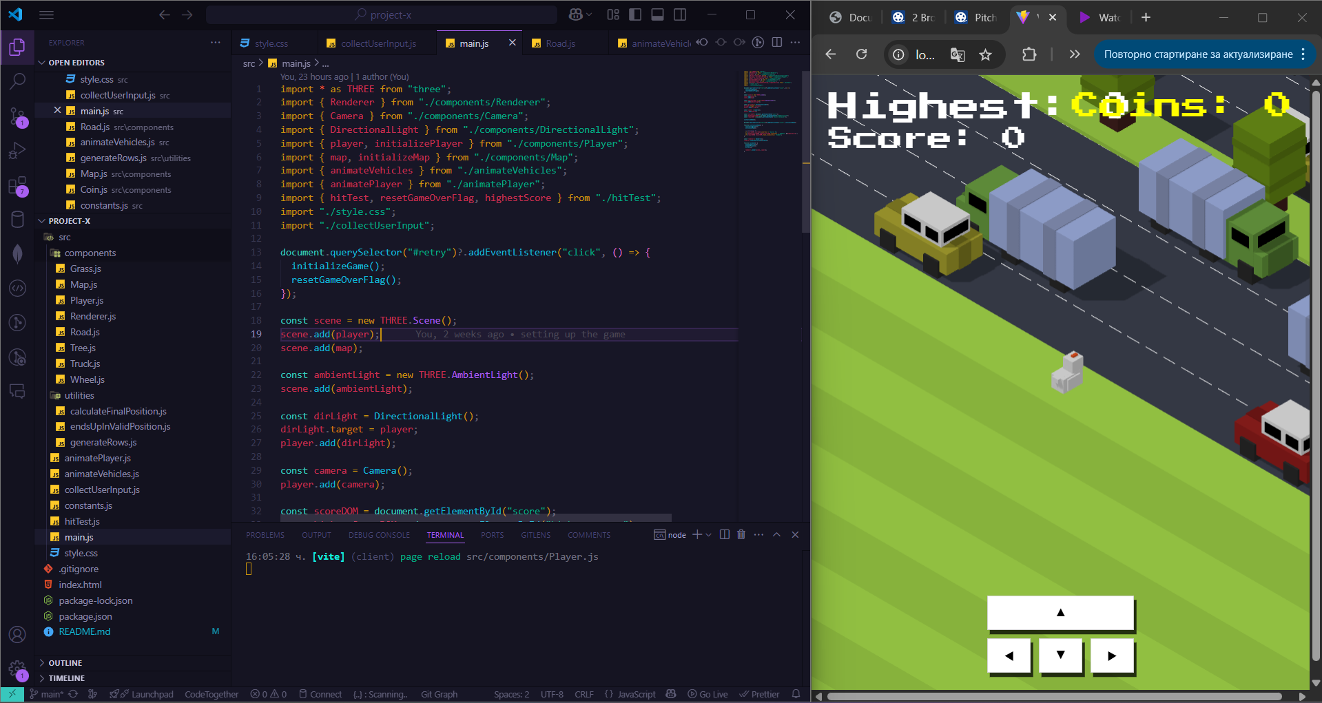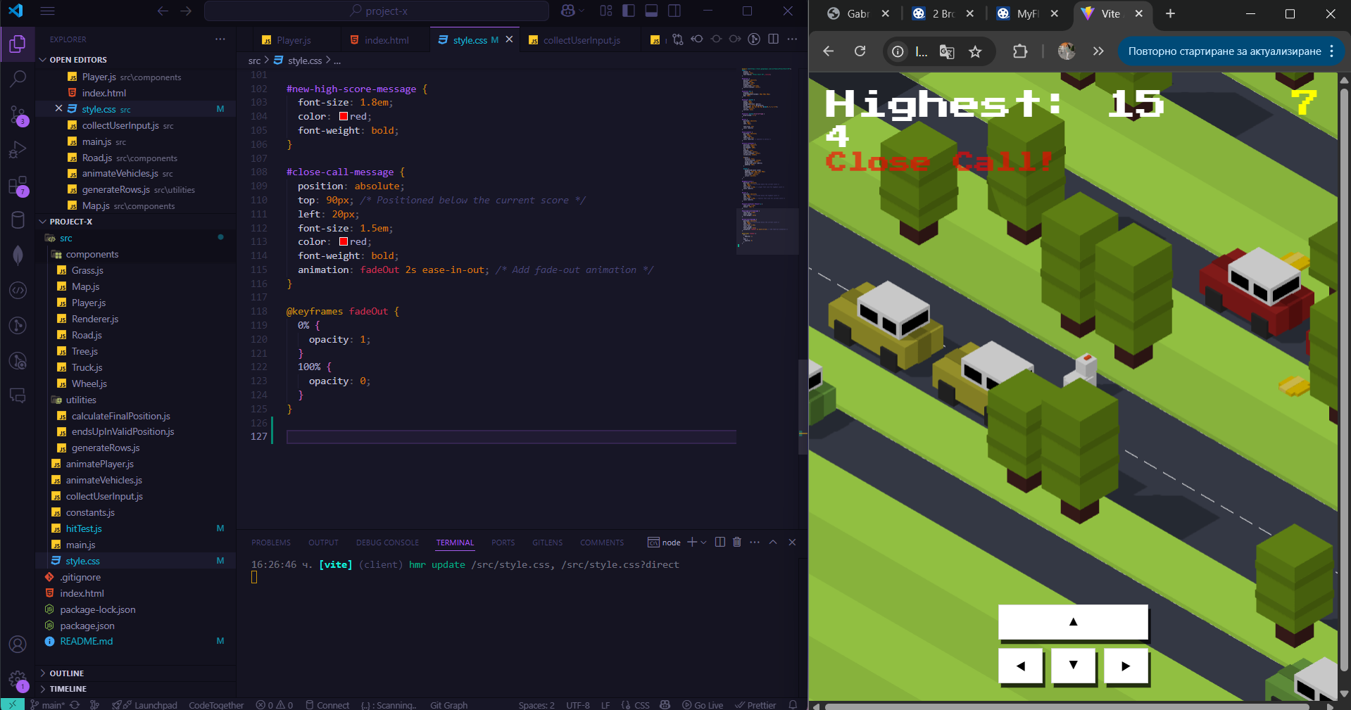 I coded some additional features to my Project X. I had a conversation with my mentor that I need to add more features on top of the ones that were in the tutorial to make the project more my own and also to show that I understand the tool I'm using (Three.js) ( ). As an additional feature I really wanted to add coin system. I told my teacher that for that I would need the coin to spin but he told me that I can do it without it. I took inspiration from the original game Crossy Road decided Make the coin models flat on the ground which made my job easier. I made it so the coins generate randomly throughout the map on the grass rows ( ). I also added a feature where if the player escapes a moving obstacle in the last moment it gives them an additional point. For that under the score counter every time that a player does a “Close call” a little message appears and adds the additional point ( ). I tried to make another skin for the player several times but every time the game crashed or the algorithm wasn't working for the new skin and also for the old one ( ). For this reason I decided to focus on the other features I wanted to include. The last improvement that I added what's suggested during the second user test. I made a counter which shows the highest score that the user performed. I added it above the current score counter and also in the result screen. When the player performs a new highest score it also shows a little message on the result screen saying “New High Score” ( ).