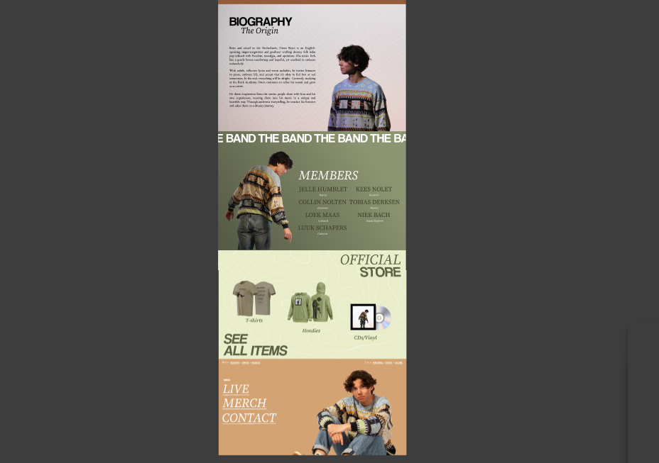 I worked on my client's website prototype for the Branding project. We discussed with the client and one of my teachers the direction we wanted to go in with the website and we chose a simple, but effective look. At first, I made a mock-up using the photos we took from the test photoshoot to decide what the layout was going to be. After the group had the photoshoot with the client, he reviewed the photos and chose the ones he liked most. I used the layout I made before with the photos from the shoot again without fully editing them just to get an idea of what the end product is going to look like with Owen and sent it to him for feedback. He really liked the direction I went in but requested to add a merchandise section and also a section for his band. Also, he wanted to add a way to contact him and to add his socials to the footer. I got right on it and started editing the photos and making the sections he requested. In the end, the result was really pleasing, and I am very proud of what I did.