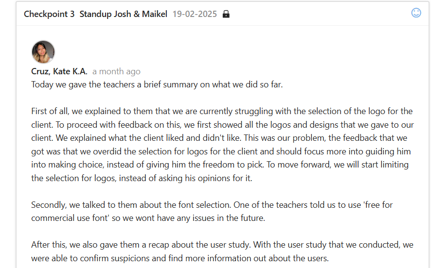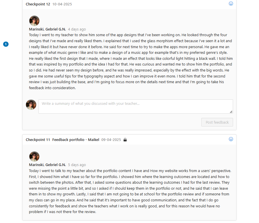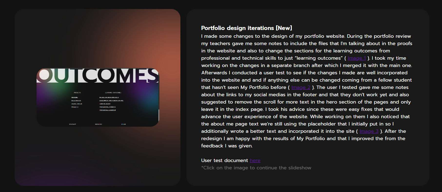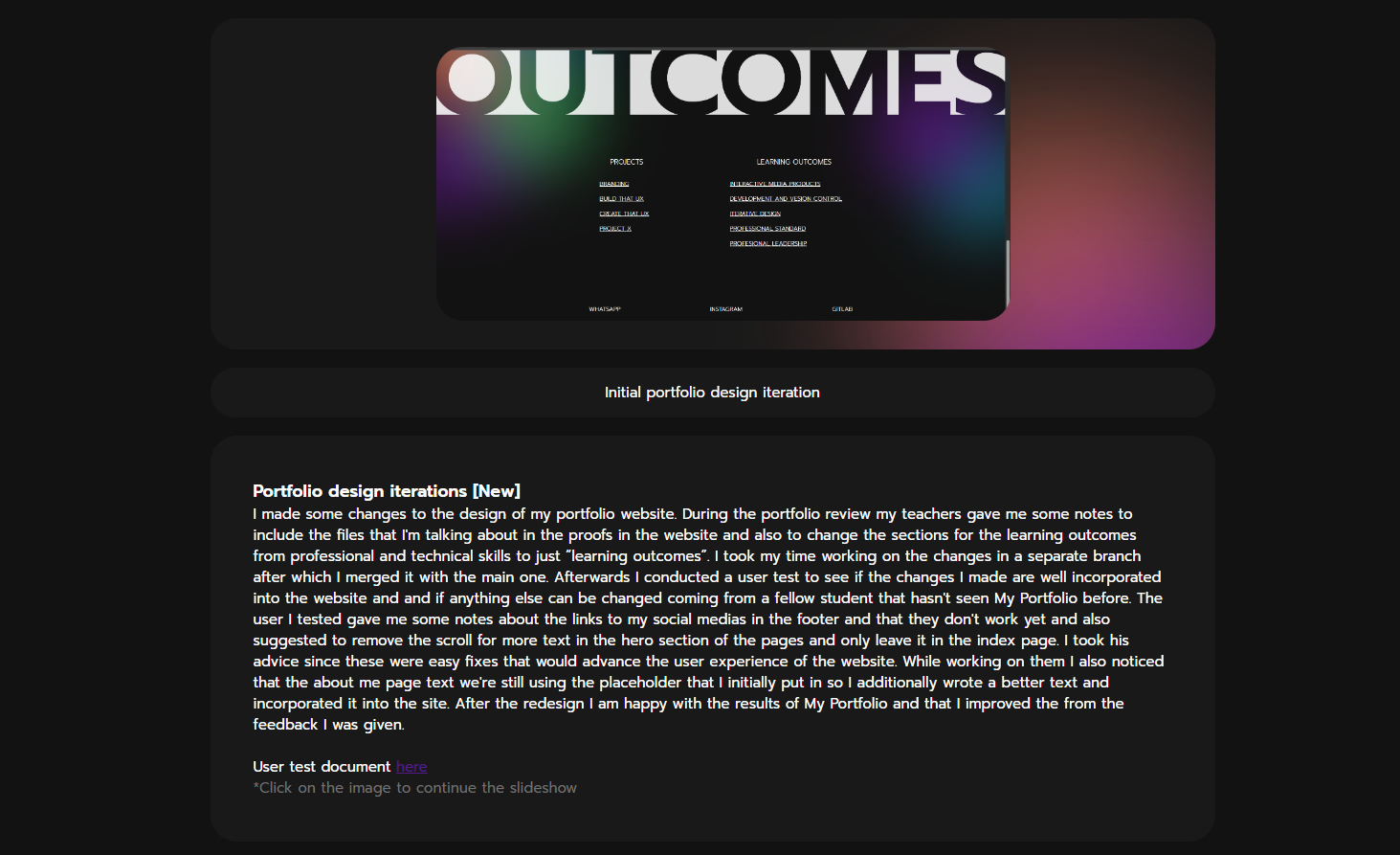 I made some changes to the design of my portfolio website. During the portfolio review my teachers gave me some notes to include the files that I'm talking about in the proofs in the website and also to change the sections for the learning outcomes from professional and technical skills to just “learning outcomes” ( ). I took my time working on the changes in a separate branch after which I merged it with the main one. Afterwards I conducted a user test to see if the changes I made are well incorporated into the website and if anything else can be changed coming from a fellow student that hasn't seen My Portfolio before ( ). The user I tested gave me some notes about the links to my social media in the footer and that they don't work yet and also suggested to remove the scroll for more text in the hero section of the pages and only leave it in the index page ( ). After the redesign, I am happy with the results of My Portfolio and that I improved from the feedback I was given.