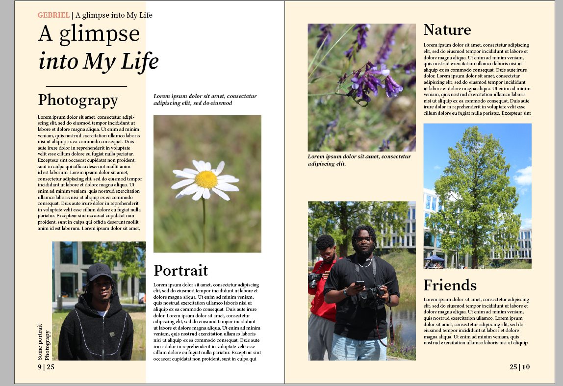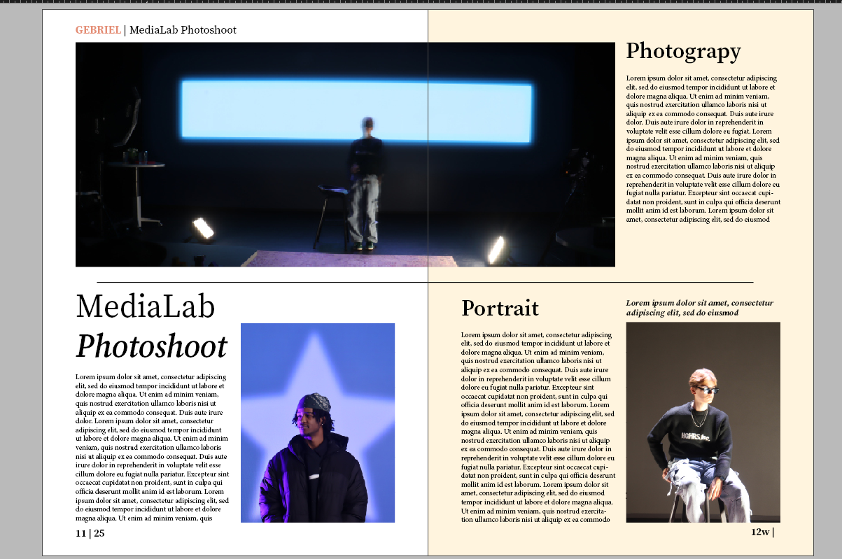 I had to work on designing a magazine. One of my teachers gave the class the assignment to work on a design for a magazine will represent some of our design work throughout the semester. I went online to look for some inspiration on how to structure the magazine content. While looking I found an example that really caught my eye( ) and decided to try to recreate it. I used Adobe InDesign to make the layout. After I was done with the initial layout it looked pretty similar to the example I found ( ) but I felt like there was something wrong with the width of the page so I went for some feedback from my teacher. He told me that I used a letter model to make the design and helped me change the scale so that it is 2 pages that are next to one another rather than one page that's cut in half. He also suggested that it would be better for me if I use the typography view rather than the one I was using before so I can see my options more clearly and make my job easier and also showed me some other tips and tricks. After the feedback session I went back to my seat and accidentally clicked the wrong key combination and lost everything that the teacher showed me. I was a bit frustrated but this was a great opportunity for me to see if I could now recreate everything that he showed me on my own. I also found another design that I used as inspiration to create two more pages ( ). I recreated it as well as I could and then remodeled my design based on the new layout and grid ( )( ). In the end I'm very proud of the results since this was the first magazine I've ever created and it was a really nice learning experience for me.