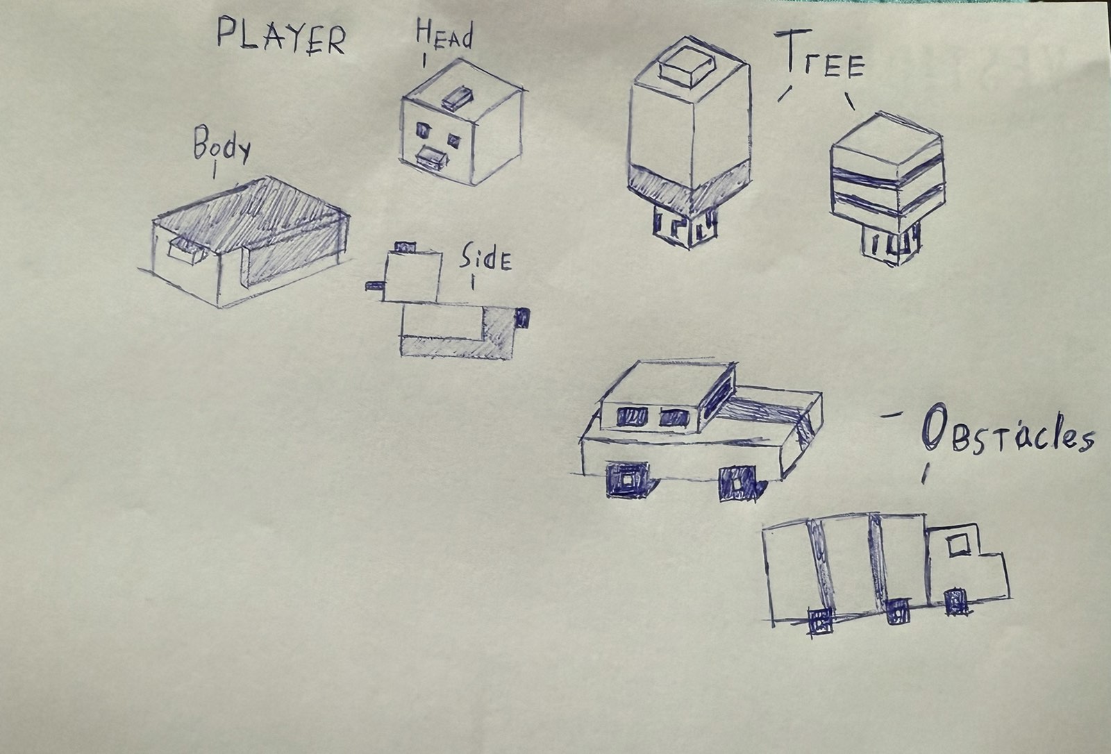 For my project X I decided to recreate the popular online game Crossy Road. I managed to find a tutorial online to help me build the base of the game using the technology I wanted to incorporate (Threejs). I took my time working with the tutorial To create the foundation of the project ( ). After finishing the tutorial I noticed that there are some bugs like for example the fact that the player could move even after being hit by an obstacle or that the map was cut out, so I focused on fixing those mistakes. After that I really wanted to work on the character and obstacle models since they were pretty basic. I sketched out a prototype of how I wanted the models to look like ( ) after which I incorporated them into the game the best that I could ( ). Now the game looked better but I still need it to test it with users. I performed an observation user test ( ). And noticed that the user couldn't tell where the boundaries of the map were and that the random generator for the road lanes created too many roads which made the game quite hard. So I worked on making the boundaries more visible and putting a max cap on the road lanes ( ).