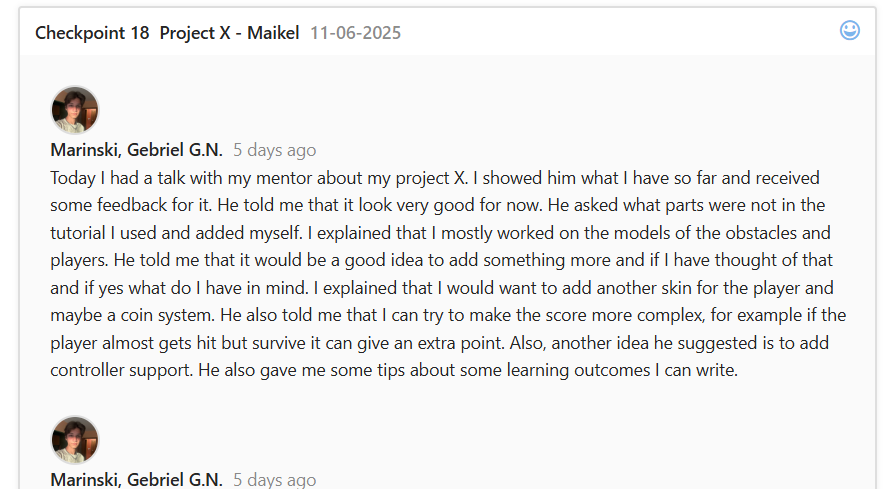 I did some changes based on feedback for my Project X. After I was done working on the feedback I received from the first user test I went to my project mentor to show him my progress so far ( ). He suggested to add more features on top of the tutorial that are not only visual and ask me what my ideas were. Explained that I wanted to add a coin system and also another skin for the player to choose from. He liked those ideas and also suggested to add for example a feature where if the player escapes are moving obstacle very closely gains an additional point. I worked on adding these features next but I couldn't figure out how to do the skin feature since the character model always crashed the skin didn't fully change and the animations didn't work and then my last try the whole game just crashed ( ). I decided to focus on the other features which in the end I managed to add. I performed another user test to see how the new features work from an outside point of view and to maybe get some more suggestions ( ). The user test went well and the tester was not confused at all by the new features and didn't need an explanation on how things work. He gave me the suggestion to add a high score counter to keep track of the latest and highest score gained ( ). I worked on implementing that feature as a last touch and that concluded my work on the project ( ).