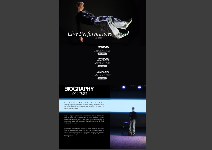 I worked on a website prototype for my group’s client Owen Bryce. I took inspirations form the websites of some of Owens’s favorite artists like Lord Huron and Tom Odell, but I focused on one of them – David Kushner we previously have discussed has the vibe that the client is looking for. The website mainly consists of photos of the artist and some interesting typography. It’s simple yet beautiful. My group and I did some research to find some fonts that will look good together and for the photos I used some of the results from the test photoshoot we did previously. With some suggestions from my fellow groupmates, I made the mockup, and it turned out really well. I made the mockup for a desktop since the website he liked was mainly intended for desktop. For the future I would do more research to better understand not only the needs of the client but also the audiences expectations. Regardless I am very proud of the result.
