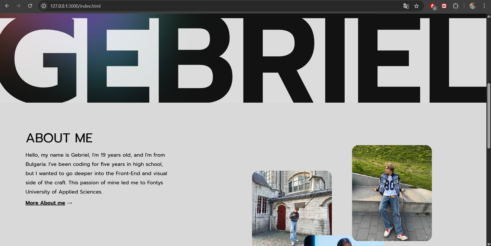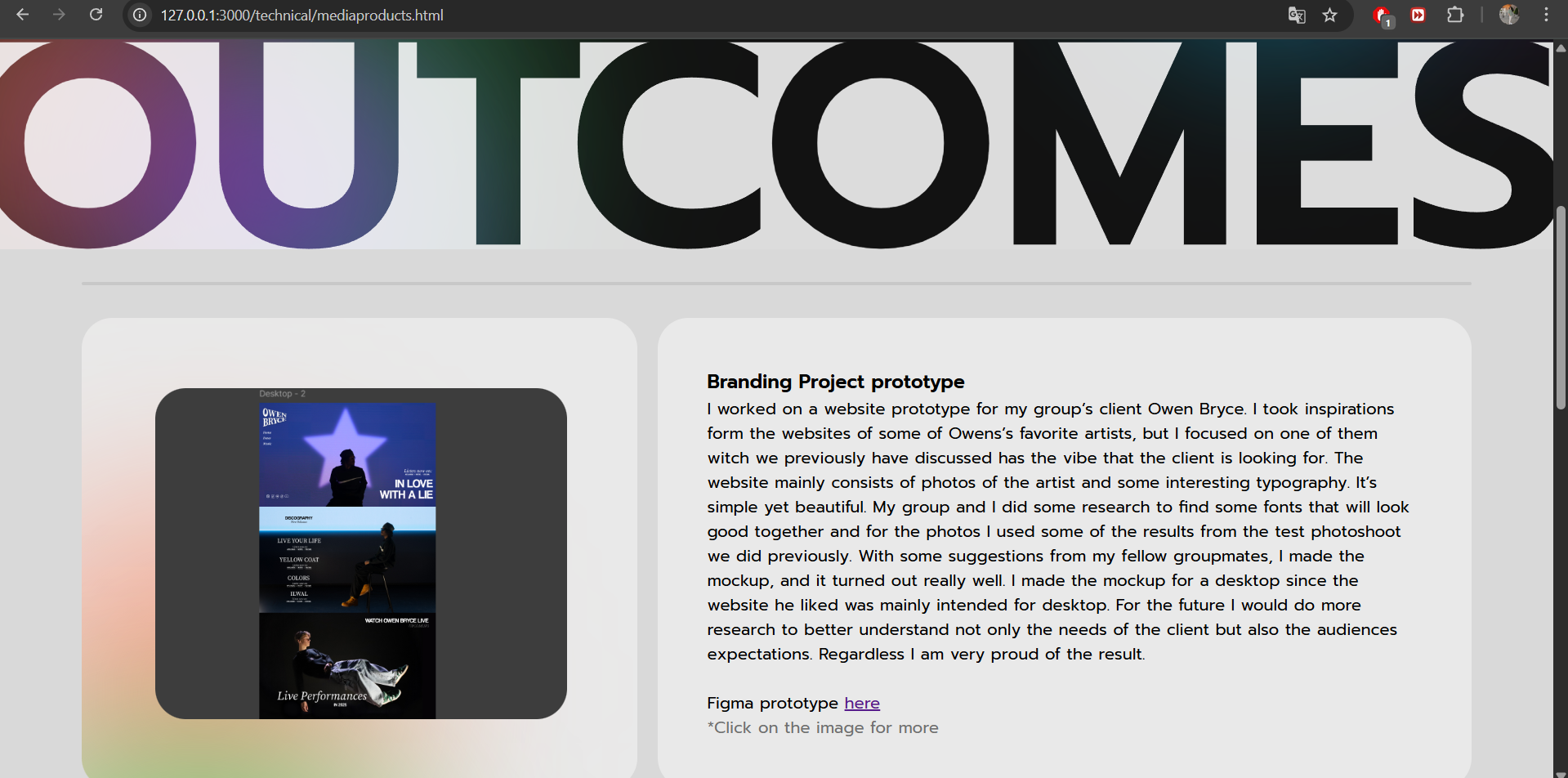 I coded the base of my portfolio. After I was done with the Figma prototype of my portfolio the next step was to code the design. I started by creating the index page and working on the pages for the learning outcomes. My goal was to have the base structure of where all the proofs are going to be and to be able to add them to the site for the second portfolio review without going into too many details like making it responsive or adding animations. After I was happy with the index page I started working on the outcomes page. I made it look somewhat like the Figma design but ran into some problems with the layout so I had to go to my teacher for help. He helped me fix the layout and some of the other problems I ran into along the way like placing the light effects in the right places. I completed the base of the outcomes page and also the projects page so the next thing I had to do was to fill the website with the information that I had previously written down. After I was done, I had some spare time to work on some of the details. I started adding the photos to the index page and working on the “about me” page. In the end I have the base done and for the next review I'm going to focus on making it interactive and adding all the details that I have in my mind.