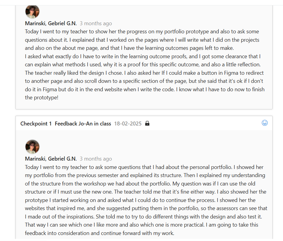 I worked on a website prototype for my personal portfolio. I went online to look for inspiration for my portfolio and found two websites that really caught my eye. I decided to try to make a combination of both. After I finished the home page, I went to get some feedback from my teacher about the layout I chose and to ask some questions about the structure. During a talk with my teacher, we discussed the learning outcomes and what I have to write in them which gave me a better idea of what to do with the structure of the other pages and so I worked on them next. After I was done, I went for another feedback session to hear my teachers’ opinions of my prototype. I received positive feedback and encouragement to continue working on what I have so far because it would turn out great. I even received some helpful advice on how to code some of the elements in the future. Next goal- code the website!