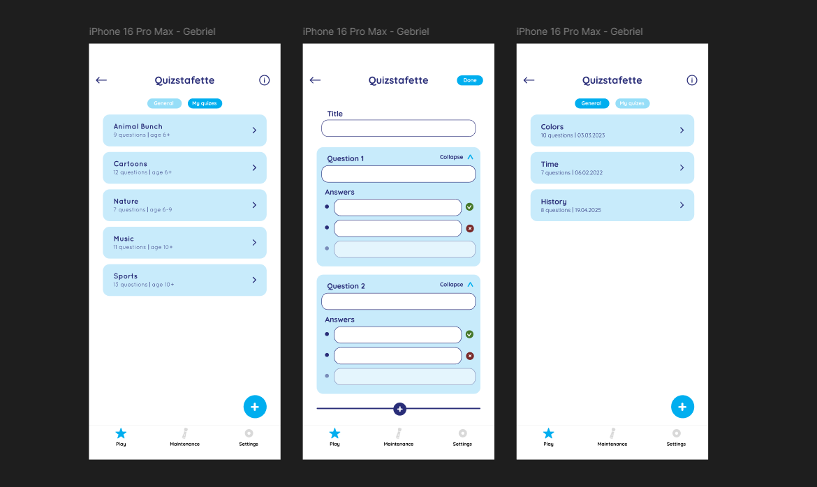 Me and my team coded the website prototype that we had previously created for the create that UX project. After doing a bit of redesigning of the figma prototype that we chose to code we started with the development. The first step was to create the base JavaScript code that would make the website function the way we want it to. I had the job I've coding that base so I started immediately. I had to make the add edit delete functionality work. After I was done with the base we divided the work three ways. I had to create the index page where the quizzes are shown and also the login and register forms. After completing this goal we tested the product with users and received some feedback from our teachers. From the user test we gathered that we had to change some buttons to make them more understandable and and the teachers gave us encouragement to try and add other functionalities that would help us learn something new so I had to create a “share quiz” function. After all of the members of the team were done with their parts we worked on consistency in making the website look complete. In the end we have a functional website for creating quizzes. All of the functionalities we had in mind before starting the development are working and the team and I are proud of our creation.