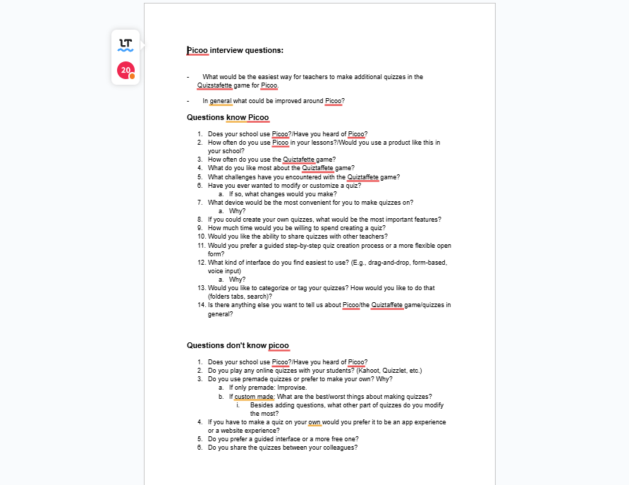 After testing the product for a while we started working on the interview questions and scheduling the interviews themselves. For the interview questions we got feedback that we first need to establish what we want to know out of the interview and then based on that to think of the questions, so that’s what we did. As for the interviews we started reaching out to friends and family who know elementary school teachers. It was quite hard trying to find elementary school teachers but at the end we managed to schedule a few interviews. Also says one of our group members is Dutch she went to her elementary school and interviewed some teachers so we can get a better conclusion on the user study having more answers.