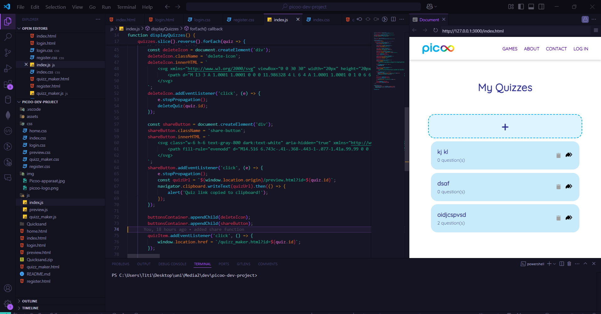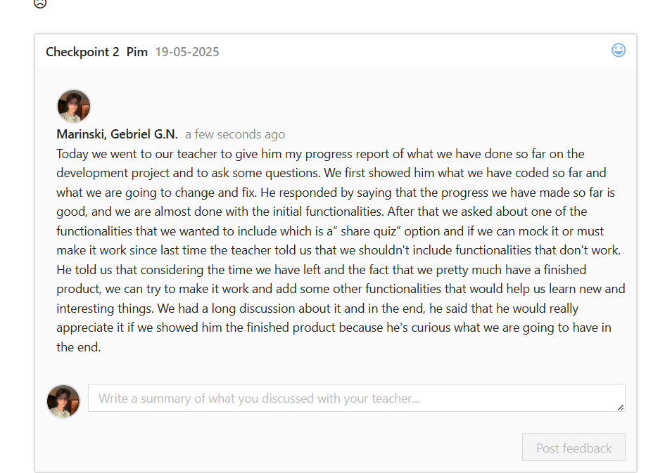I had to make a share quiz functionality for my development project. For the development project me and my group decided that after we are done with the main design and functionality if we had time we would add some additional functions for a better experience. One of those functions was to add a share quiz functionality. I got the job to code this into the project after talking to one of our teachers about what we wanted to implement additionally and learn something new from it. I thought about how the function is going to work and started coding. I noticed that when the quizzes are being edited it shows the id in the search bar, so first I added the button to share and grabbed the link with the id from the search. After that I went online to search for some examples of how to copy the link to the clipboard and for a SVG icon for the button. I added the code I found after which I tested it and it worked exactly as its supposed to. Next I worked a bit on the design of the button and on placing it in the right position. In the end I implemented the function and I am very proud of myself for exploring more the JavaScript language. For next time I will also use the open graph protocol from the beginning so I can have a picture and text when the link is being shared