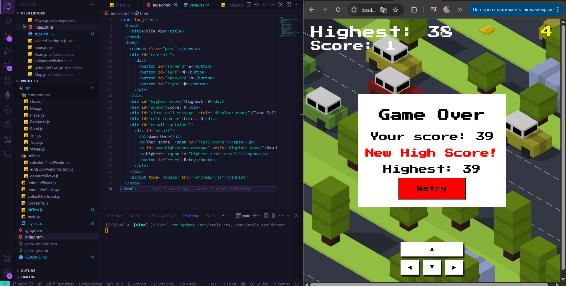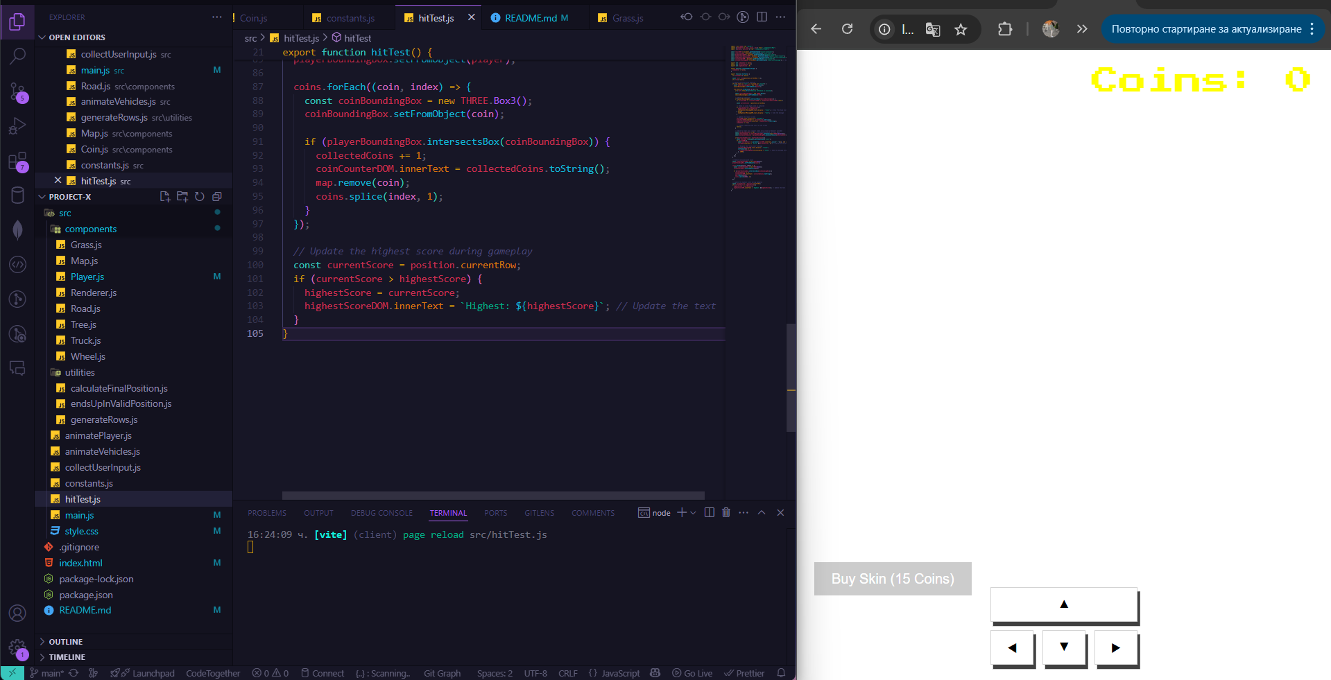 I coded some additional features to my Project X. I had a conversation with my mentor that I need to add more features on top of the ones that were in the tutorial to make the project more my own and also to show that I understand the tool I'm using (Three.js) ( ). As an additional feature I really wanted to add coin system. I told my teacher that for that I would need the coin to spin but he told me that I can do it without it. I took inspiration from the original game Crossy Road decided Make the coin models flat on the ground which made my job easier. I made it so the coins generate randomly throughout the map on the grass rows ( ). I also added a feature where if the player escapes a moving obstacle in the last moment it gives them an additional point. For that under the score counter every time that a player does a “Close call” a little message appears and adds the additional point ( ). I tried to make another skin for the player several times but every time the game crashed or the algorithm wasn't working for the new skin and also for the old one ( ). For this reason I decided to focus on the other features I wanted to include. The last improvement that I added what's suggested during the second user test. I made a counter which shows the highest score that the user performed. I added it above the current score counter and also in the result screen. When the player performs a new highest score it also shows a little message on the result screen saying “New High Score” ( ).