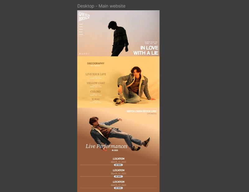 I worked on my client's website prototype for the Branding project. We discussed with the client and one of my teachers the direction we wanted to go in with the website and we chose a simple, but effective look. At first, I made a mock-up using the photos we took from the test photoshoot to decide what the layout was going to be. After the group had the photoshoot with the client, he reviewed the photos and chose the ones he liked most. I used the layout I made before with the photos from the shoot again without fully editing them just to get an idea of what the end product is going to look like with Owen and sent it to him for feedback. He really liked the direction I went in but requested to add a merchandise section and also a section for his band. Also, he wanted to add a way to contact him and to add his socials to the footer. I got right on it and started editing the photos and making the sections he requested. In the end, the result was really pleasing, and I am very proud of what I did.