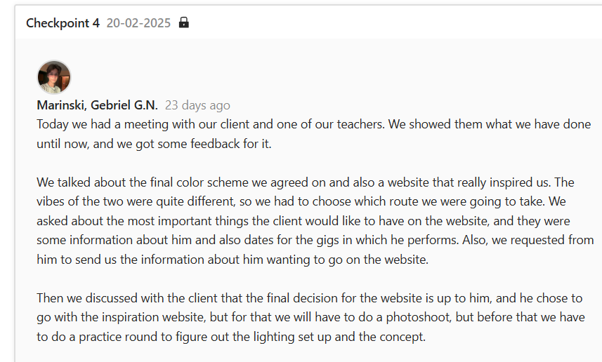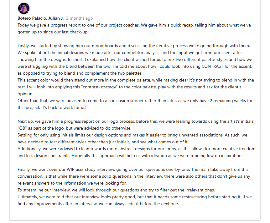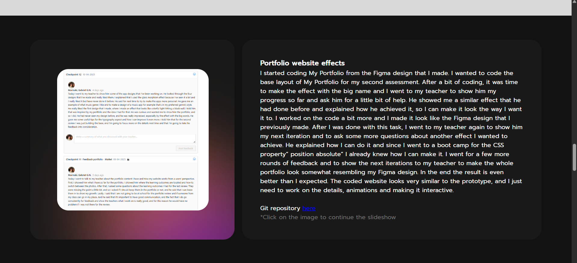 I made some changes in My Portfolio. After my last portfolio review the feedback that I got from my assessors were that the layout that I use for the website it's really limiting. Especially for one of the iterative process learning outcome it's hard to understand how the iterations go without being able to see the pictures clearly ( ). So I worked on the feedback and made two options for a small redesign of the layout of this specific learning outcome, one where the pictures are bigger but sit on top have the text ( )and the other where the pictures are incorporated into the text and the user can click on them while they're reading ( ). After doing that I went to my teachers to get some feedback from them and to see which of the two designs would be more understandable for them. Both of my teachers agreed that the design they like better is the second one. The initial idea I had was to link the pictures to a separate tab but one of the teachers suggested that I can make it into a pop up window without needing to open each picture in a different tab. I took his advice and made a pop up window where the user can even got through all of the pictures in this learning outcome ( ). I'm really happy with the results.