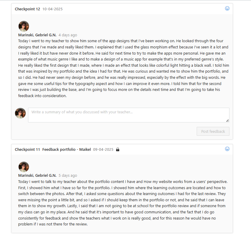 I made some changes to the design of my portfolio website. During the portfolio review my teachers gave me some notes to include the files that I'm talking about in the proofs in the website and also to change the sections for the learning outcomes from professional and technical skills to just “learning outcomes” ( ). I took my time working on the changes in a separate branch after which I merged it with the main one. Afterwards I conducted a user test to see if the changes I made are well incorporated into the website and if anything else can be changed coming from a fellow student that hasn't seen My Portfolio before ( ). The user I tested gave me some notes about the links to my social media in the footer and that they don't work yet and also suggested to remove the scroll for more text in the hero section of the pages and only leave it in the index page ( ). After the redesign, I am happy with the results of My Portfolio and that I improved from the feedback I was given.