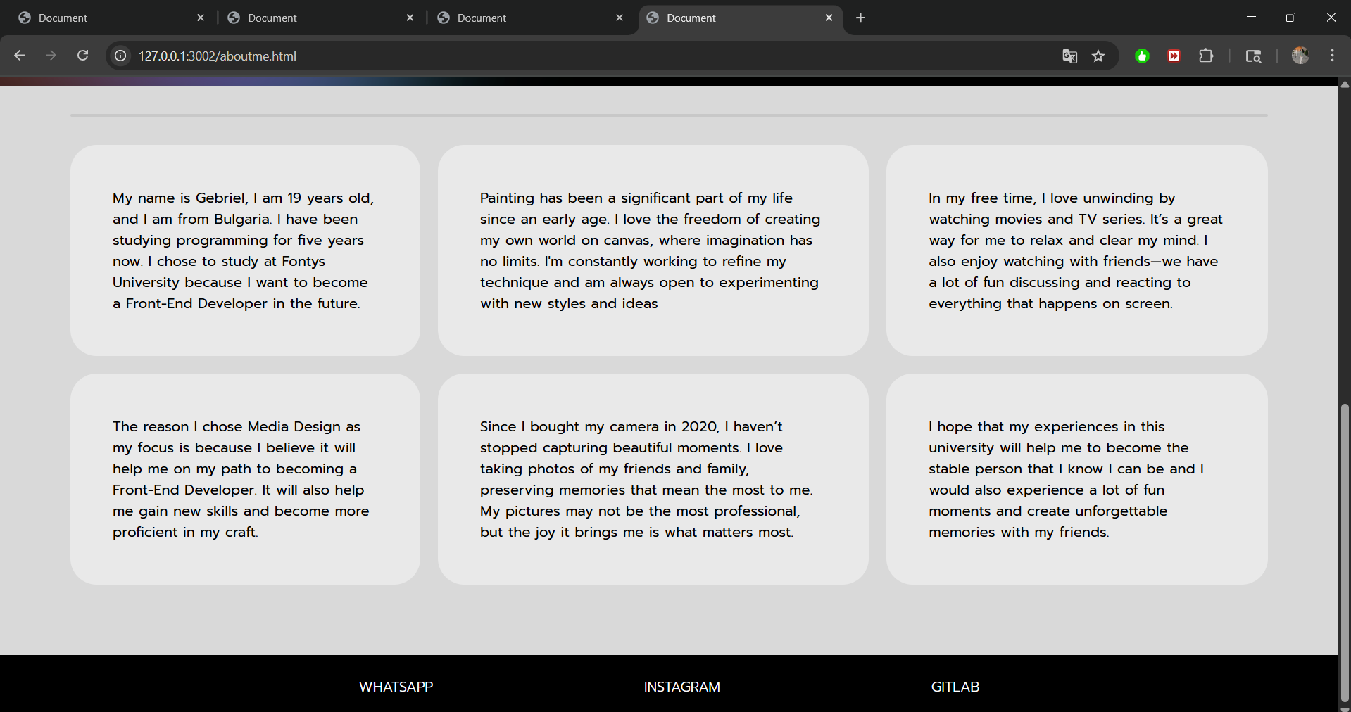 I started coding My Portfolio from the Figma design that I made. I wanted to code the base layout of My Portfolio for my second assessment. After a bit of coding, it was time to make the effect with the big name and I went to my teacher to show him my progress so far and ask him for a little bit of help. He showed me a similar effect that he had done before and explained how he achieved it, so I can make it look the way I want it to. I worked on the code a bit more and I made it look like the Figma design that I previously made. After I was done with this task, I went to my teacher again to show him my next iteration and to ask some more questions about another effect I wanted to achieve. He explained how I can do it and since I went to a boot camp for the CSS property” position absolute” I already knew how I can make it. I went for a few more rounds of feedback and to show the next iterations to my teacher to make the whole portfolio look somewhat resembling my Figma design. In the end the result is even better than I expected. The coded website looks very similar to the prototype, and I just need to work on the details, animations and making it interactive.