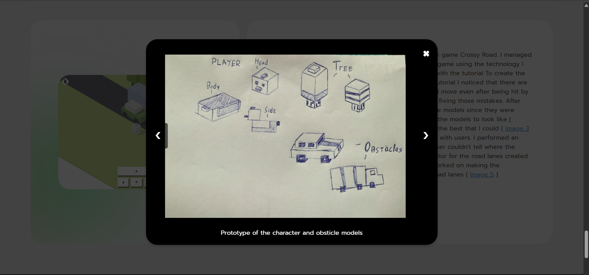 For my project X I decided to recreate the popular online game Crossy Road. I managed to find a tutorial online to help me build the base of the game using the technology I wanted to incorporate (Threejs). I took my time working with the tutorial To create the foundation of the project ( ). After finishing the tutorial I noticed that there are some bugs like for example the fact that the player could move even after being hit by an obstacle or that the map was cut out, so I focused on fixing those mistakes. After that I really wanted to work on the character and obstacle models since they were pretty basic. I sketched out a prototype of how I wanted the models to look like ( ) after which I incorporated them into the game the best that I could ( ). Now the game looked better but I still need it to test it with users. I performed an observation user test ( ). And noticed that the user couldn't tell where the boundaries of the map were and that the random generator for the road lanes created too many roads which made the game quite hard. So I worked on making the boundaries more visible and putting a max cap on the road lanes ( ).