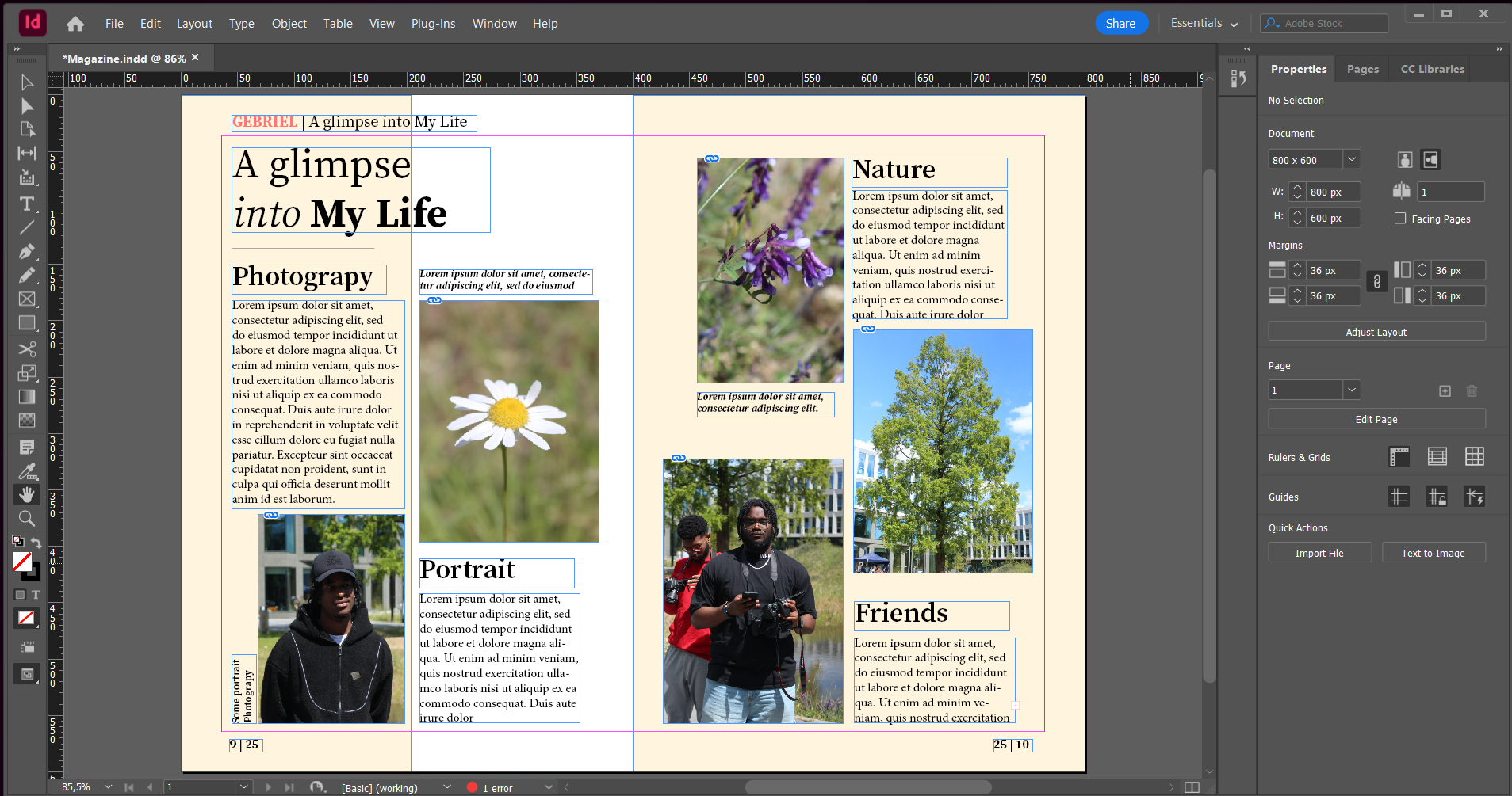 I had to work on designing a magazine. One of my teachers gave the class the assignment to work on a design for a magazine will represent some of our design work throughout the semester. I went online to look for some inspiration on how to structure the magazine content. While looking I found an example that really caught my eye( ) and decided to try to recreate it. I used Adobe InDesign to make the layout. After I was done with the initial layout it looked pretty similar to the example I found ( ) but I felt like there was something wrong with the width of the page so I went for some feedback from my teacher. He told me that I used a letter model to make the design and helped me change the scale so that it is 2 pages that are next to one another rather than one page that's cut in half. He also suggested that it would be better for me if I use the typography view rather than the one I was using before so I can see my options more clearly and make my job easier and also showed me some other tips and tricks. After the feedback session I went back to my seat and accidentally clicked the wrong key combination and lost everything that the teacher showed me. I was a bit frustrated but this was a great opportunity for me to see if I could now recreate everything that he showed me on my own. I also found another design that I used as inspiration to create two more pages ( ). I recreated it as well as I could and then remodeled my design based on the new layout and grid ( )( ). In the end I'm very proud of the results since this was the first magazine I've ever created and it was a really nice learning experience for me.