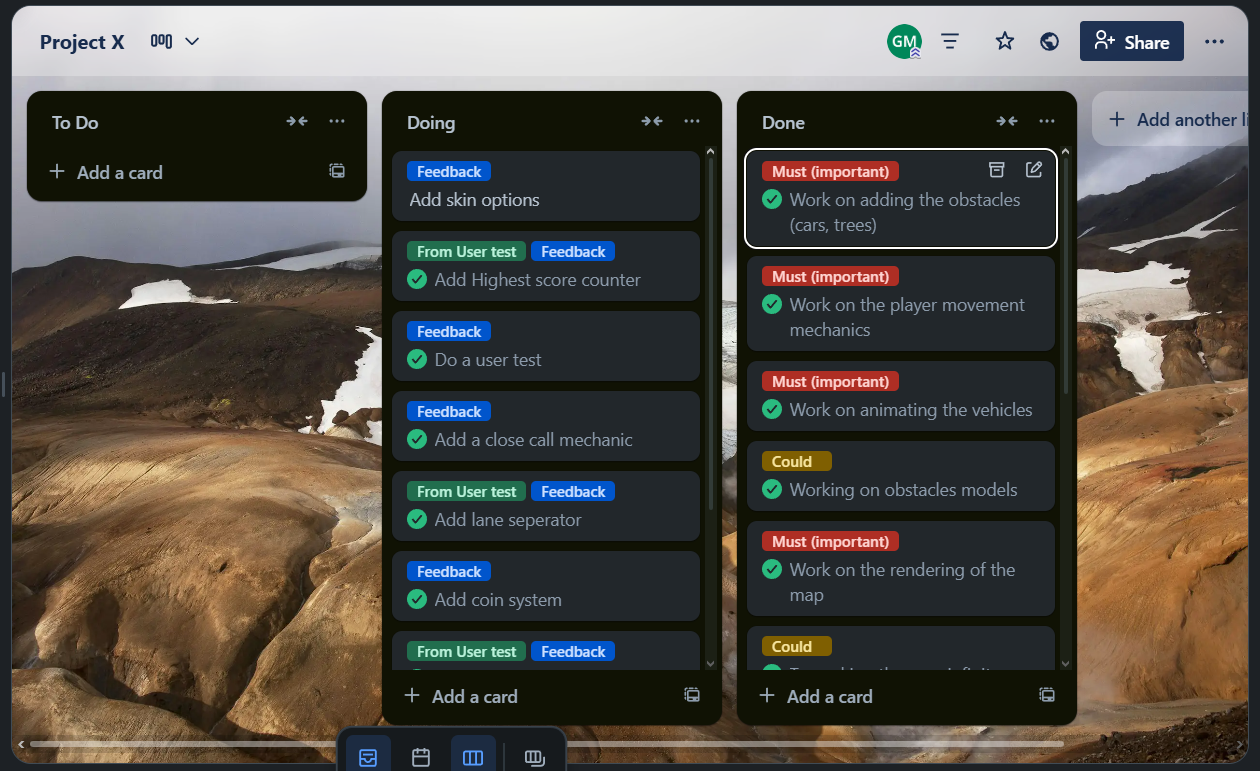 I did some changes based on feedback for my Project X. After I was done working on the feedback I received from the first user test I went to my project mentor to show him my progress so far ( ). He suggested to add more features on top of the tutorial that are not only visual and ask me what my ideas were. Explained that I wanted to add a coin system and also another skin for the player to choose from. He liked those ideas and also suggested to add for example a feature where if the player escapes are moving obstacle very closely gains an additional point. I worked on adding these features next but I couldn't figure out how to do the skin feature since the character model always crashed the skin didn't fully change and the animations didn't work and then my last try the whole game just crashed ( ). I decided to focus on the other features which in the end I managed to add. I performed another user test to see how the new features work from an outside point of view and to maybe get some more suggestions ( ). The user test went well and the tester was not confused at all by the new features and didn't need an explanation on how things work. He gave me the suggestion to add a high score counter to keep track of the latest and highest score gained ( ). I worked on implementing that feature as a last touch and that concluded my work on the project ( ).