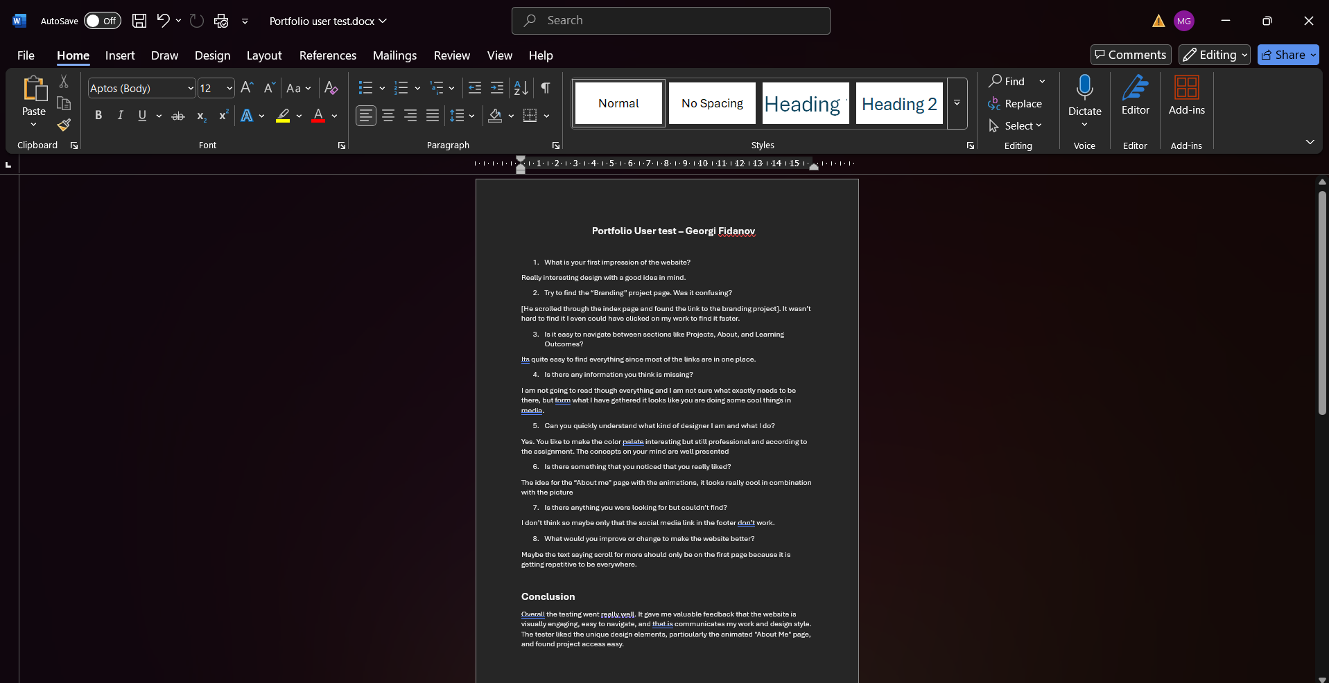 I performed a user test on My Portfolio website. I wanted to know if the website that I am developing is easy to navigate and clear for the users. For this reason I decided to perform a user test. I previously wrote down some questions that I wanted to ask the user during and after the test. For example I asked him about his first impressions of the website, to go to some different pages so I can see if he navigates easy and about things he couldn't find but wanted to. In the end I also asked if there are some things that he would like to be changed to make the website better. Overall the tester really liked the design and said that it looks professional but interesting. He especially enjoyed the “about me” page for which he said that it's really well combined the picture I chose. He did have some notes about a text which says “scroll for more” and that it is a bit repetitive to be in every page and suggested that I should leave it only for the index page and remove it from the others. Also she noticed that I didn't add links to my social medias in the footer. This user test was a great experience to show me an outside view of the project that I was working on and to help me improve it even further.